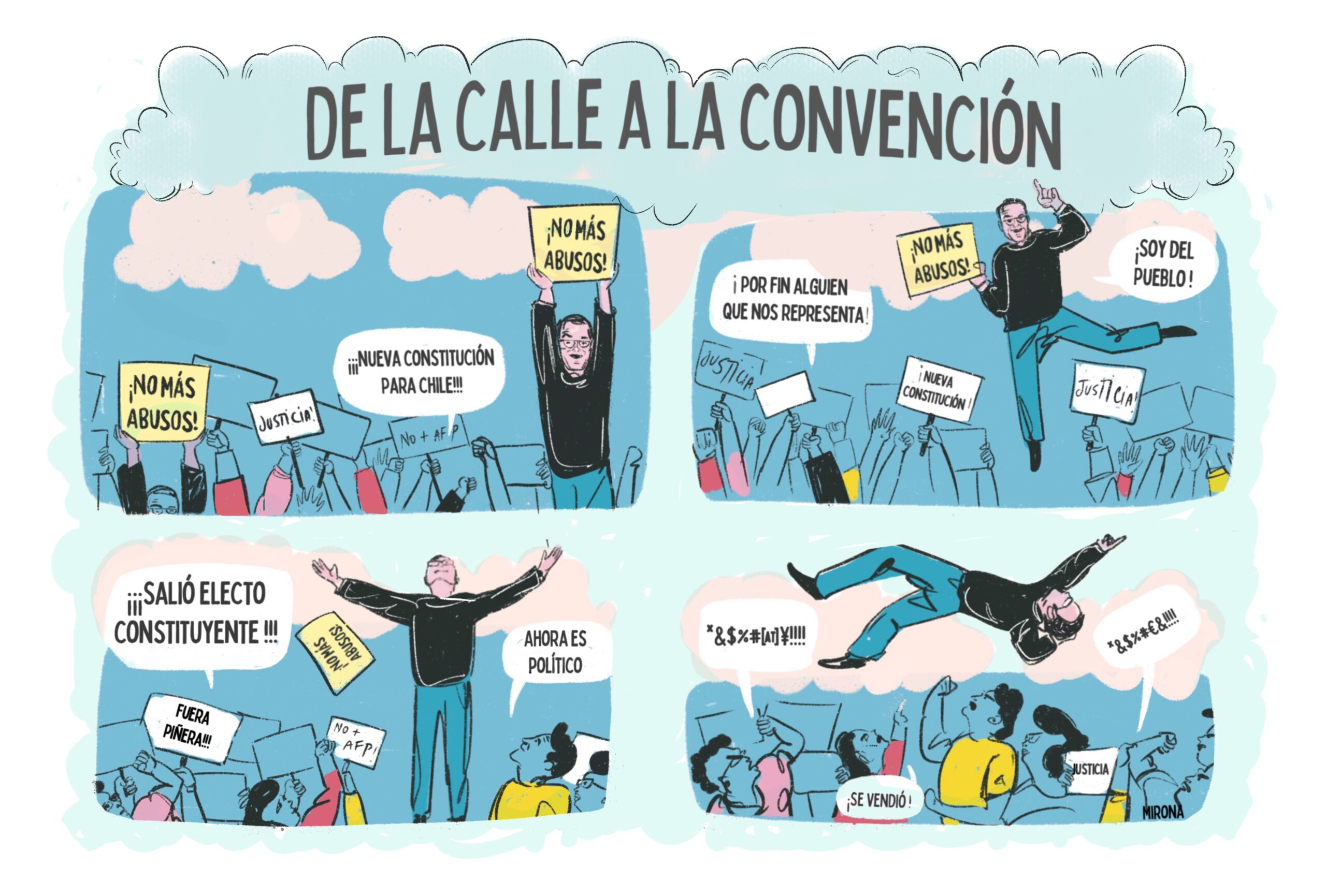 Chaque mois, des illustratrices et illustrateurs racontent en images le processus constituant à travers trois caricatures* respectivement accompagnées d’une capsule vidéo.
