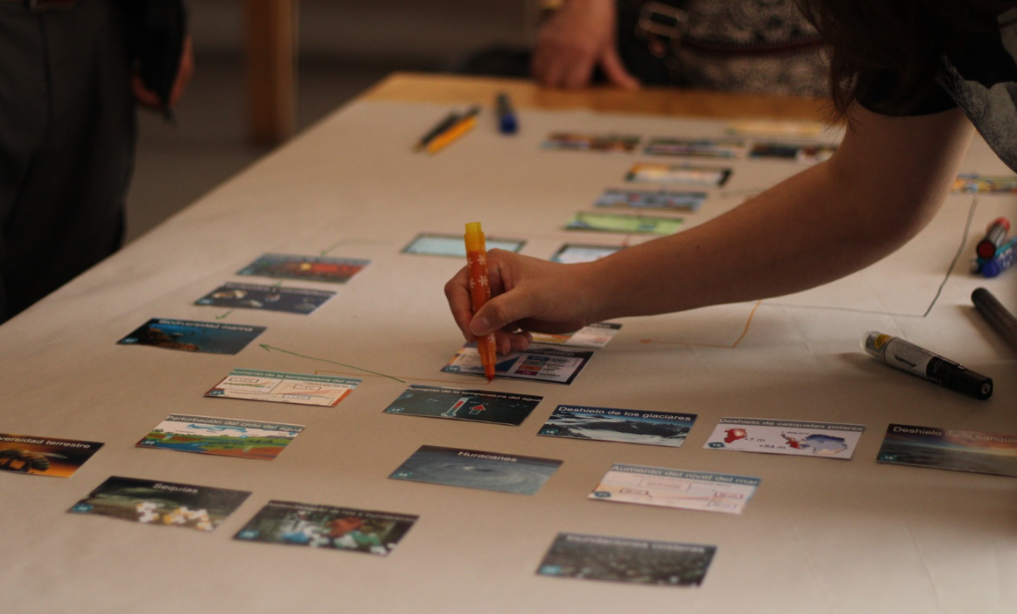 En équipe, guidés par leur animateur, les participants doivent trouver la relation de cause à effet entre les différentes composantes du changement climatique. C’est l’intelligence collective qui leur permettra de passer d’une étape à l’autre.